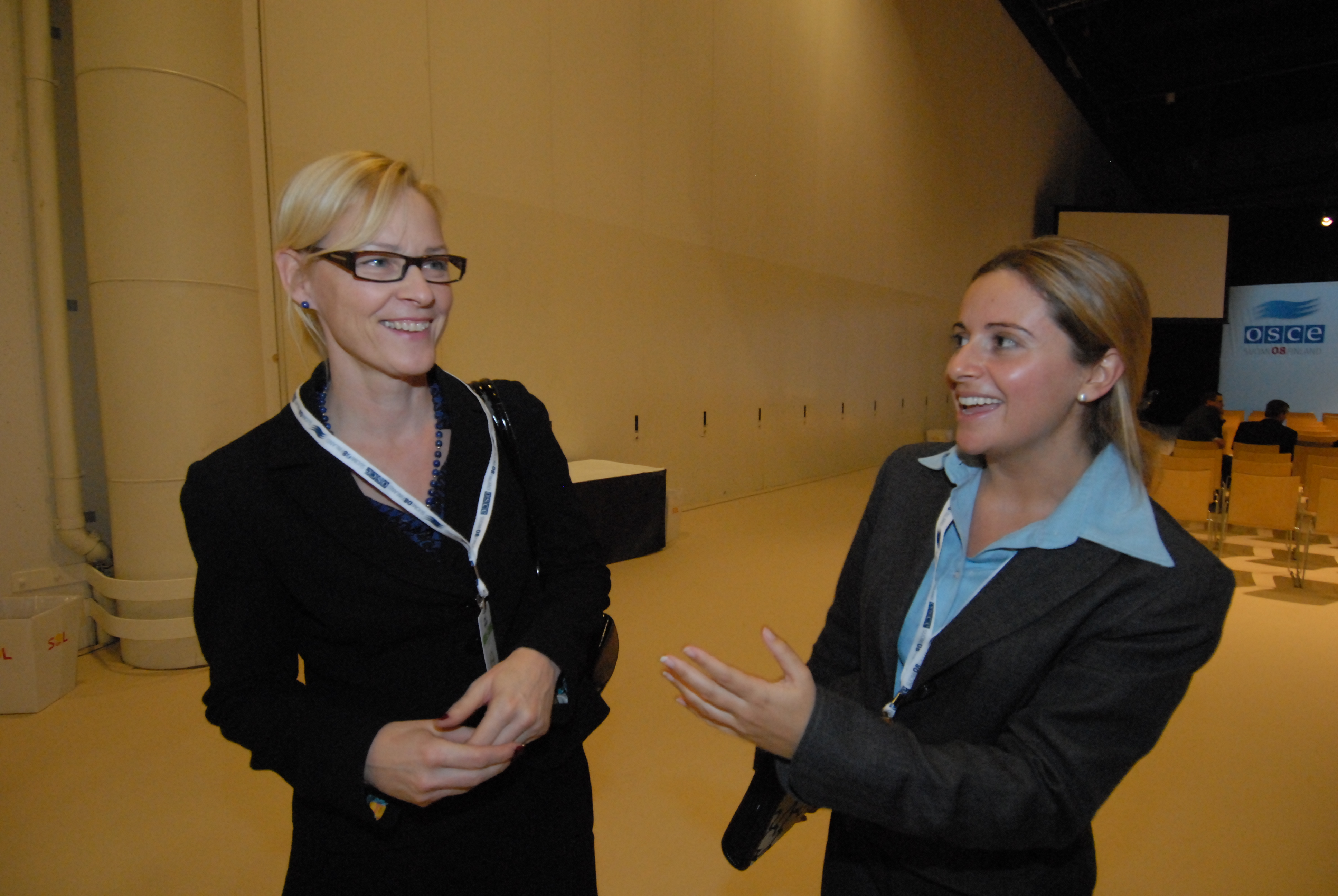 Special Representative on combating human trafficking Eva Biaudet (left) and her Office's spokesperson Blanca Tapia at the 16th OSCE Ministerial Council in Helsinki, 3 December 2008.