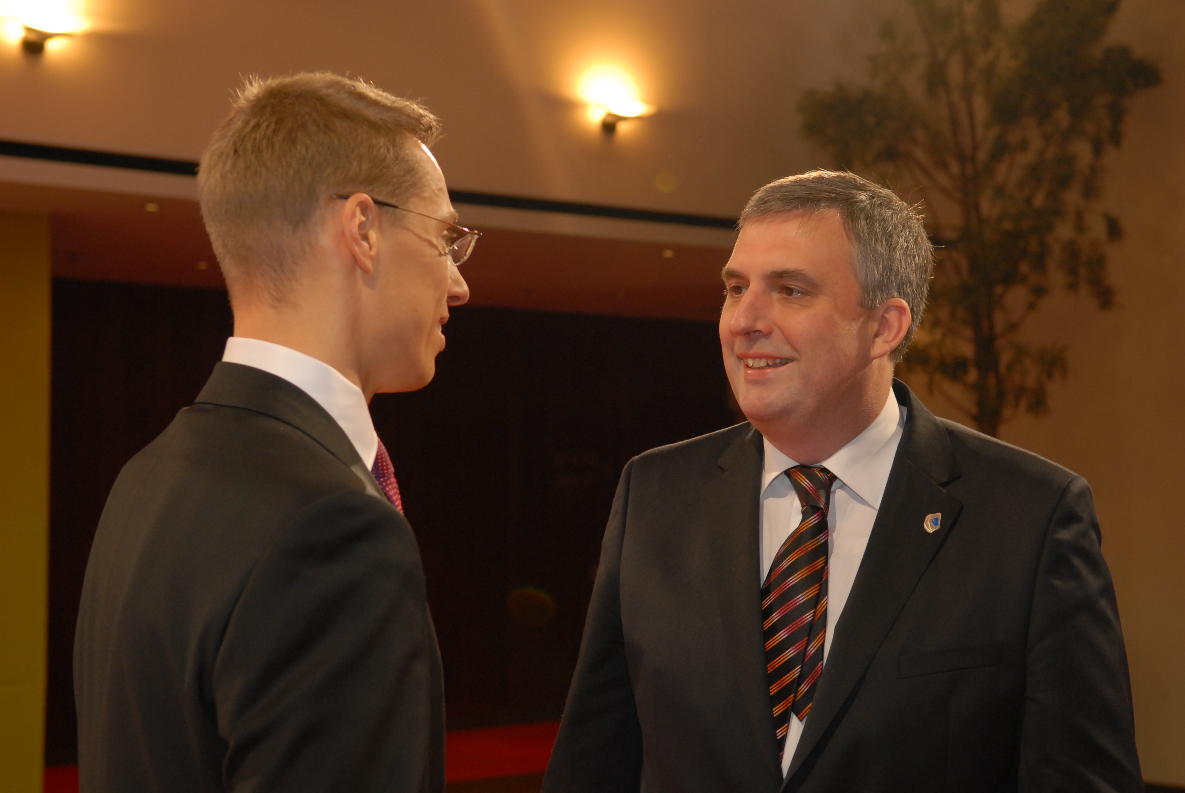 OSCE Chairman-in-Office, Finnish Foreign Minister Alexander Stubb (left), welcomes Bulgarian Foreign Minister Ivailo Kalfin at the 16th OSCE Ministerial Council in Helsinki, 4 December 2008.