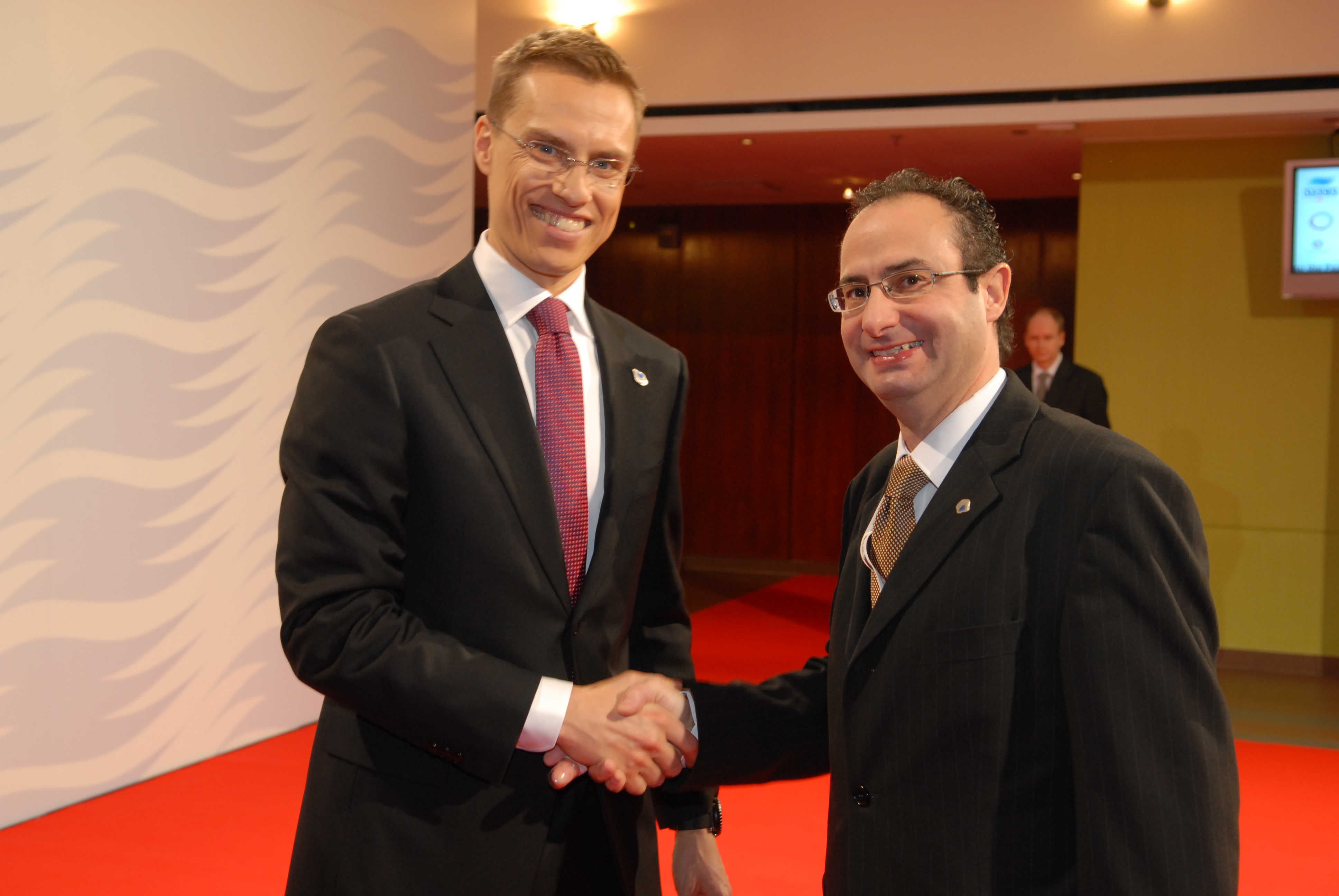 OSCE Chairman-in-Office, Finnish Foreign Minister Alexander Stubb (left), welcomes Carmel Inguanez, Director General for European and Economic Affairs, Ministry of Foreign Affairs of Malta, at the 16th OSCE Ministerial Council in Helsinki.
