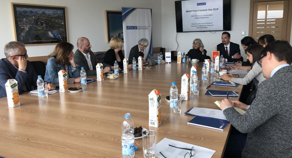 PODGORICA, 3. maj 2019 – Obilježavajući Svjetski dan slobode štampe, Misija OEBS-a u Crnoj Gori i njeni medijski partneri okupili su se danas u Podgorici kako bi razgovarali o posebnoj ulozi koju kvalitetno novinarstvo i provjeravanje činjenica mogu odigrati kada se suočavamo sa dezinformacijama.