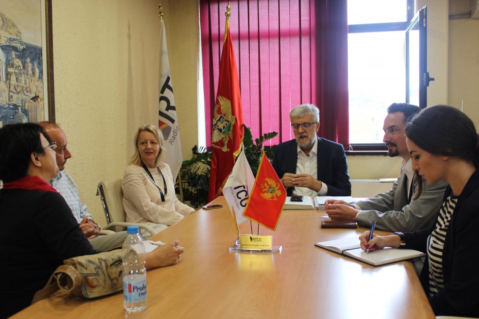 Generalni direktor crnogorskog nacionalnog Javnog servisa (RTCG) Božidar Šundić (c) ugostio je eksperta i bivšeg urednika redakcije za monitoring u BBC-ju Stivena Hermana (l) i menadžera medijskog programa u Misiji OEBS-a u Crnoj Gori Daniela Blanka uoči internog treninga na temu digitalizacije, Podgorica, 29. jul 2019. godine.