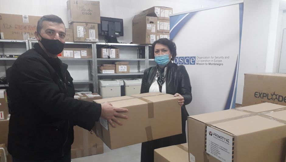 Predstavnik Misije OEBS-a u Crnoj Gori, Radovan Bogetić, predaje paket jakni i prsluka sa oznakom „PRESS“ Lidiji Vukčević iz nacionalnog Javnog servisa (RTCG), 7. aprila 2021. godine.