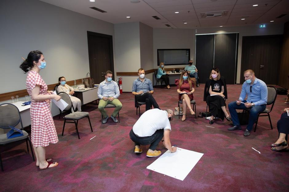 Zaposleni u u stručnoj službi Skupštine Crne Gore razgovaraju o efikasnoj komunikaciji i dobrim tehnikama prezentacije, na radionici koju je organizovala Misija OEBS-a u Crnoj Gori, Podgorica, 27. jul 2021. godine.