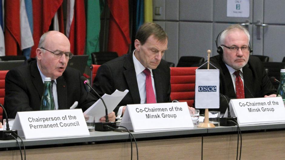 L-r: The Co-Chairs of the OSCE Minsk Group, Ambassadors Bernard Fassier of France, Robert Bradtke of the United States, and Igor Popov of the Russian Federation, presenting their annual report of activities to the OSCE Permanent Council, Vienna, 3 November 2011.