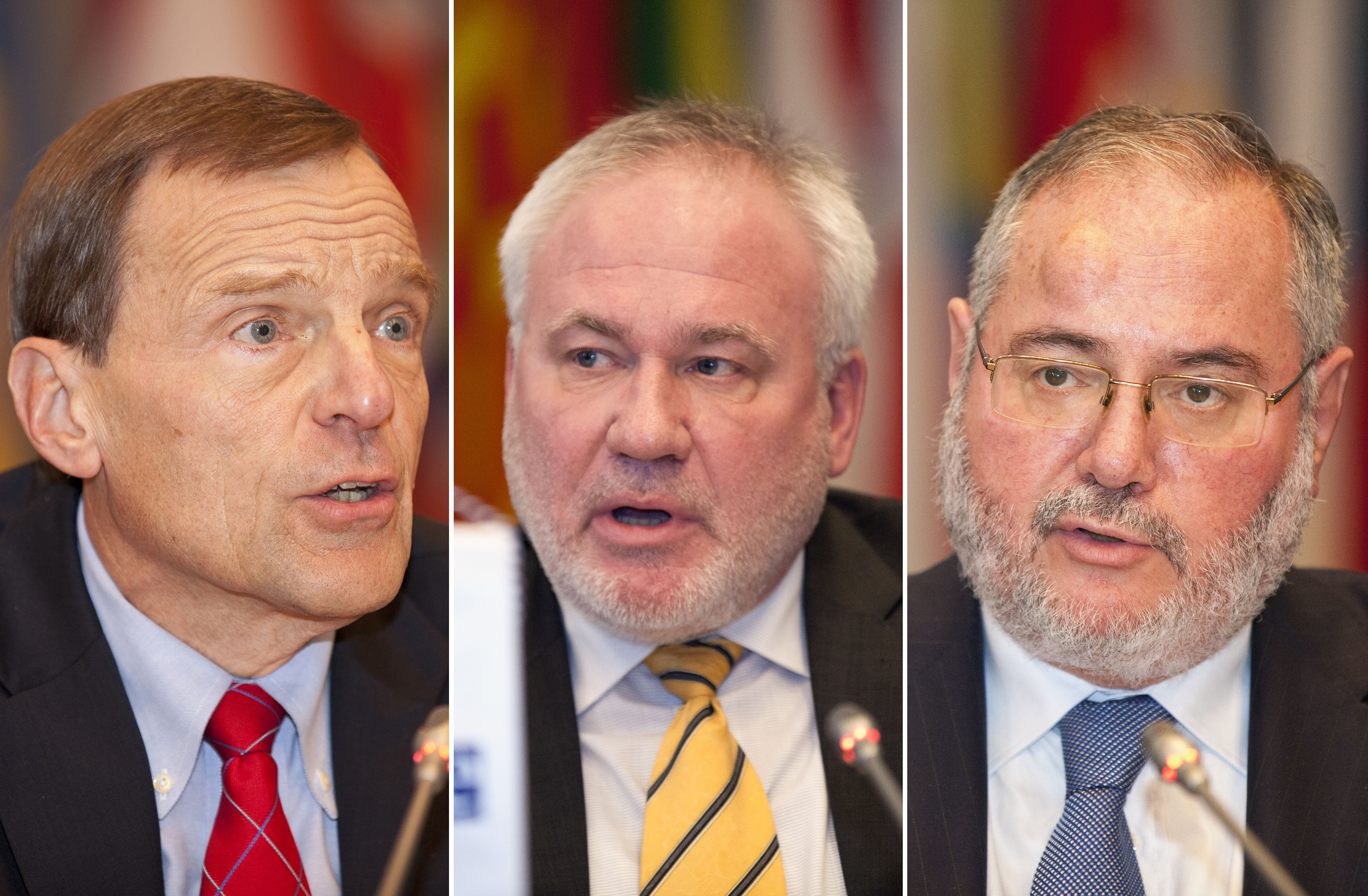 L-r: The Co-Chairs of the OSCE Minsk Group, Ambassadors Robert Bradtke of the United States, Igor Popov of the Russian Federation, and Jacques Faure of France, addressing the OSCE's Permanent Council in Vienna, 8 November 2012.