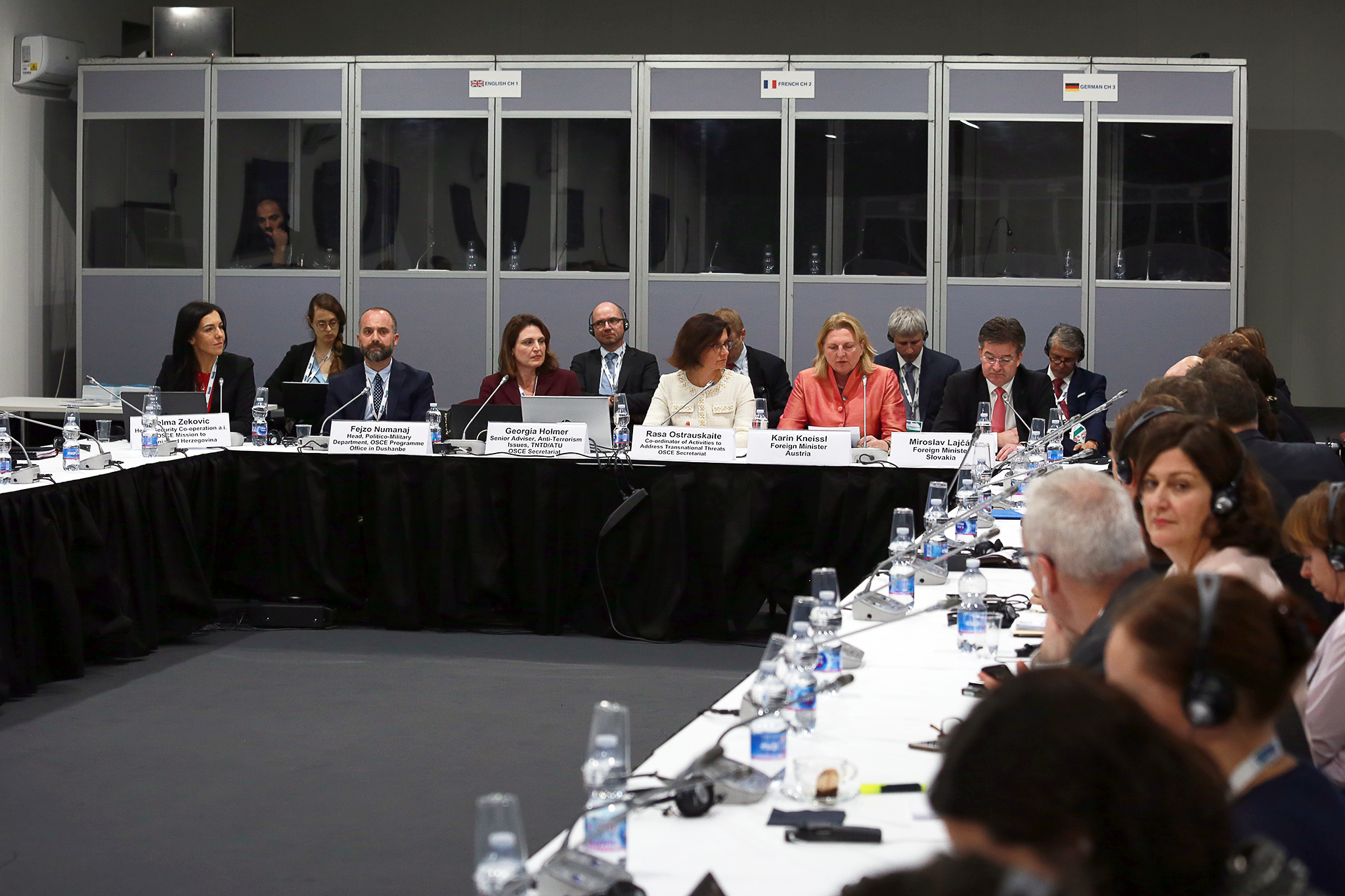 Side-event on preventing and countering violent extremism and radicalization that lead to terrorism at the OSCE Ministerial Council in Milan, 7 December 2018. Panel l-r: Selma Zekovic, OSCE Mission to Bosnia and Herzegovina; Fejzo Numanaj, OSCE Programme Office in Dushanbe; Georgia Holmer, Action against Terrorism Unit, Transnational Threats Department, OSCE Secretariat; Rasa Ostrauskaite, Co-ordinator of Activities to Address Transnational Threats, OSCE Secretariat; Karin Kneissl, Austrian Foreign Minister; Miroslav Lajčák, Slovakian Foreign Minister.