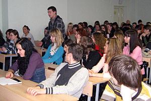Students at the Sociology Department of the Belarusian State University respond to presentations from Deputy Head of OSCE Office in Minsk Jandos Asanov and OSCE Programme Manager Francois-Vadim de Hartingh, 26 November 2009.