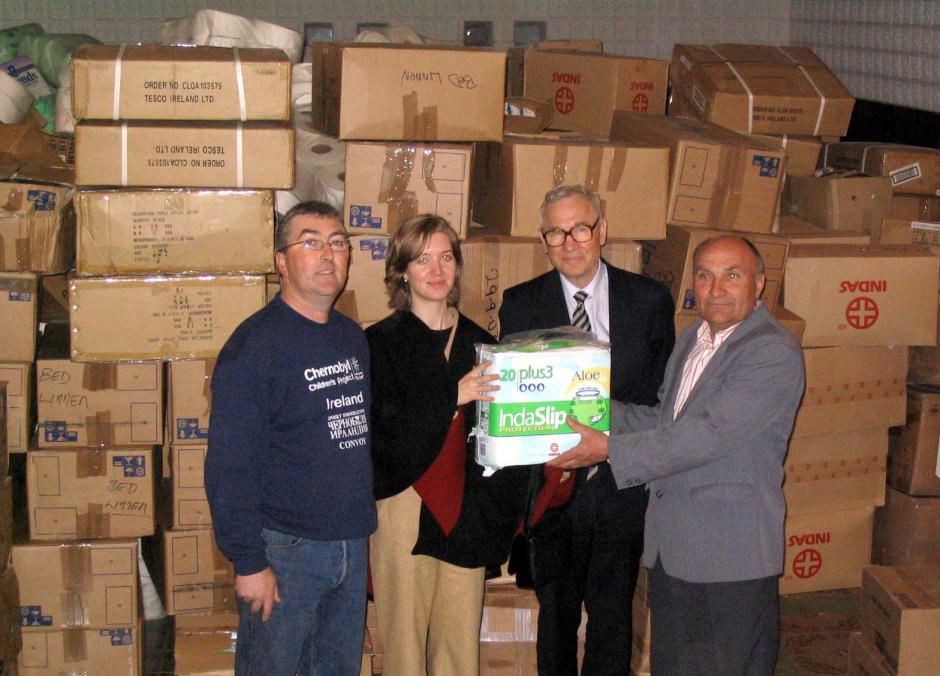 Ambassador Eberhard Heyken (2. right), Head of the Office in Minsk, with aid supplies during a charity visit to an orphanage in Mogilev region, part of the "Chernobyl Children's project", in April 2004.