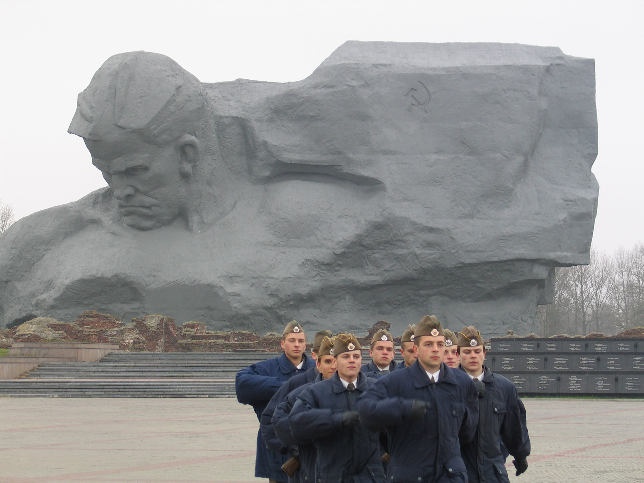 Young guards march in front of a monument in the Brest fortress in Belarus, depicting the courage of the soldiers that defended it. The fortress took the first blow during the Nazi invasion in 1941.