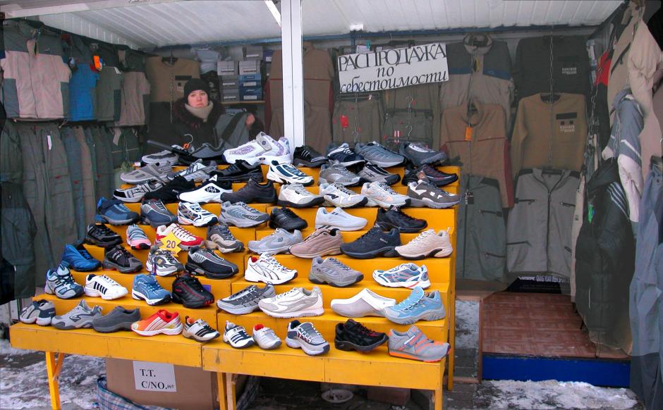 A vendor sells shoes in a market in Minsk, in 2003.