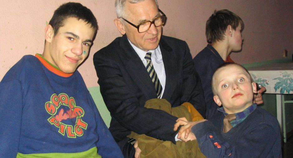 Ambassador Eberhard Heyken, Head of the OSCE Office in Minsk, with disabled children during a charity visit to an orphanage in Mogilev region, part of the "Chernobyl Children's project", in April 2004.