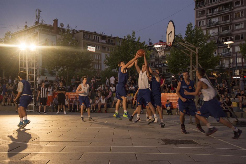 Members of ethnically-mixed Dream Team and the New Team compete in the final game of the basketball tournament, leaving language and ethnic barriers behind to play for a common aim and win the competition.