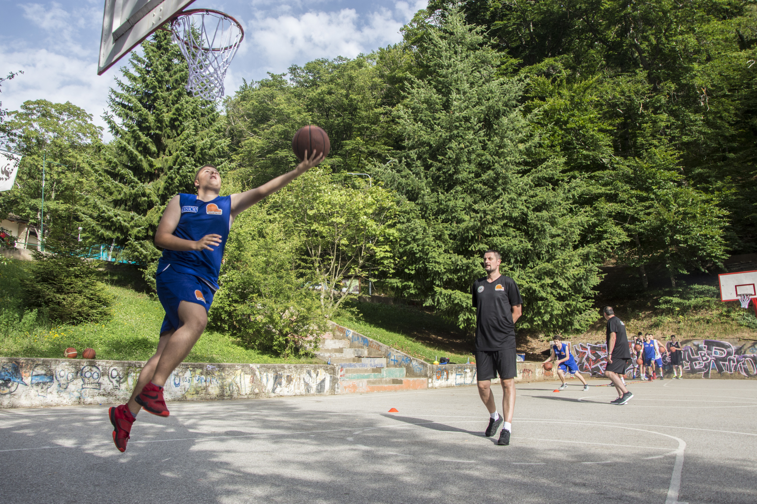 Coach Bojan Popović proudly supervises a young basketballer from BC Shtërpcë/Štrpce while he shows off his skills by going for the shoot with style.