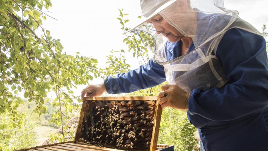 Valbona Salihu, attending to one of her beehives, Syriganë/Suvo Grlo, 18 August 2017.