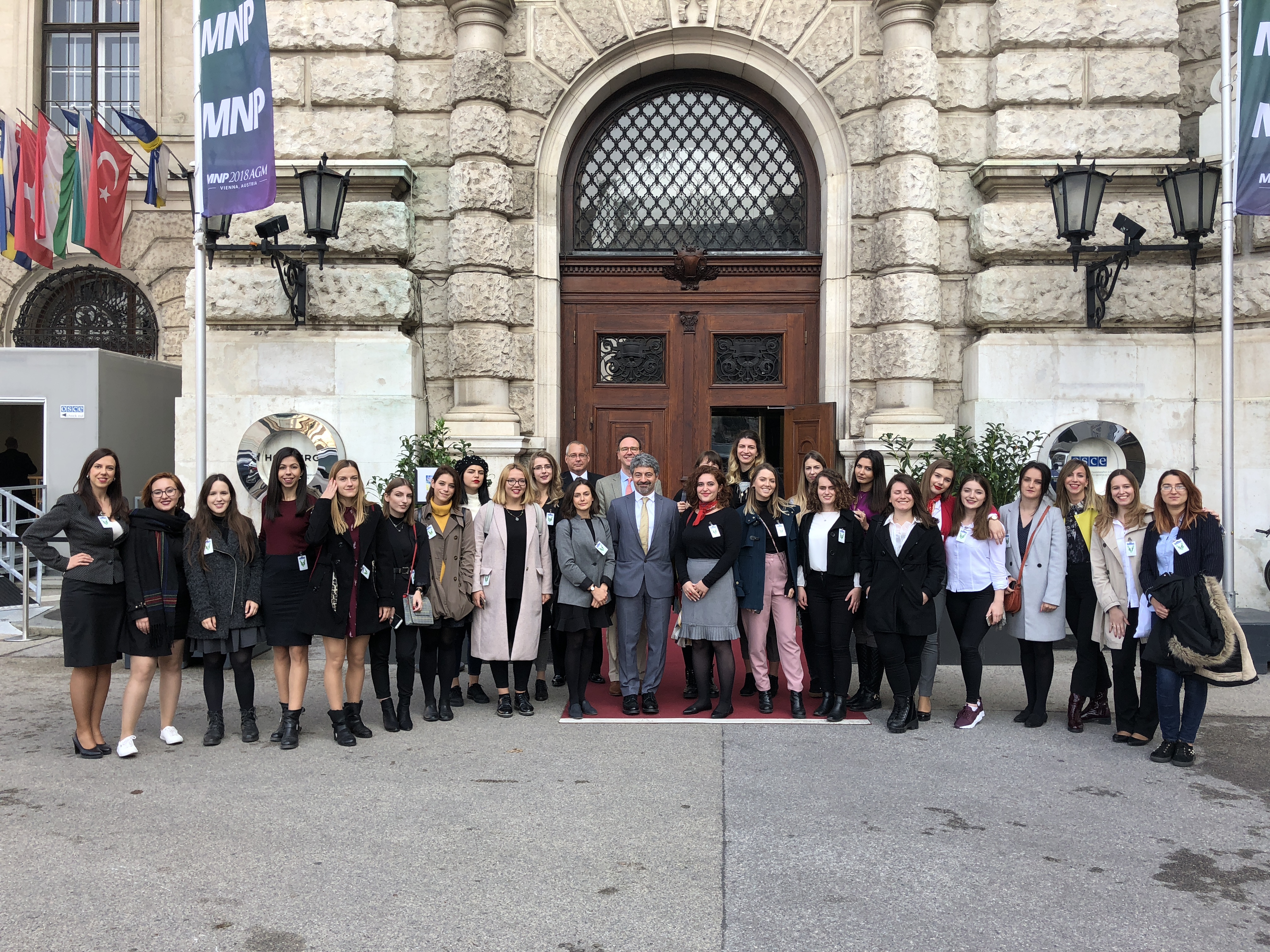 Participants of the fourth edition of OSCE-supported Dialogue Academy for Young Women from Prishtinë/Priština and Belgrade in front of Hofburg Palace, home to OSCE Permanent Council in Vienna, Austria, 18 October 2018.