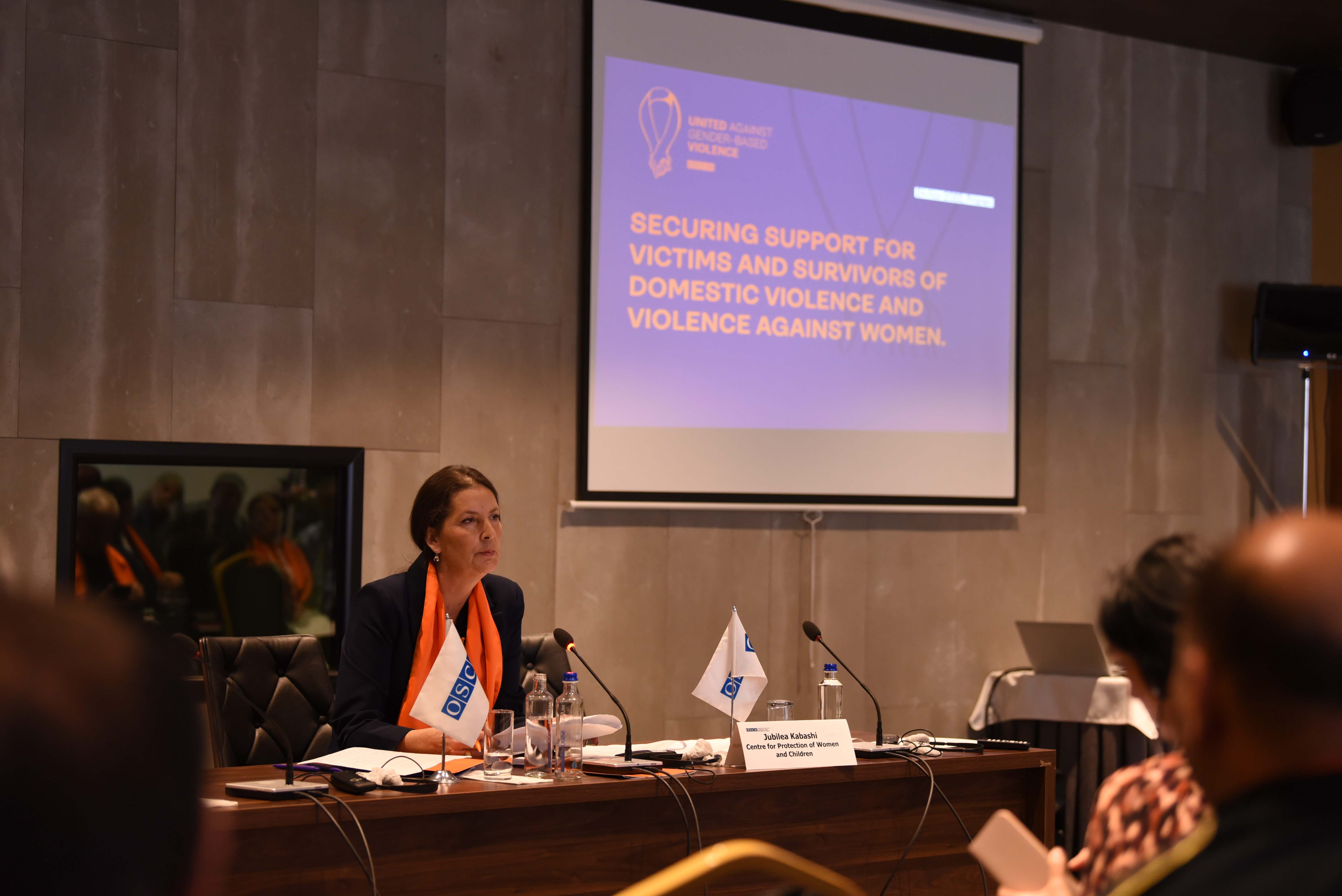 Jubilea Kabashi, the Manager of the Housing Center for Women and Children, attends an OSCE Mission in Kosovo high-level event in Prizren for the 16 Days of Activism against Gender-Based Violence, November 2022.