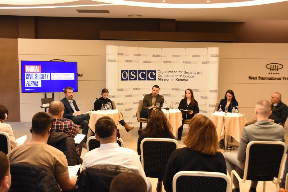 Representatives of civil society organizations discuss how to consolidate local civic activism to better contribute to a vibrant and inclusive public and political life during the 6th Annual Civil Society Forum organized by the OSCE Mission in Kosovo, December 2022.