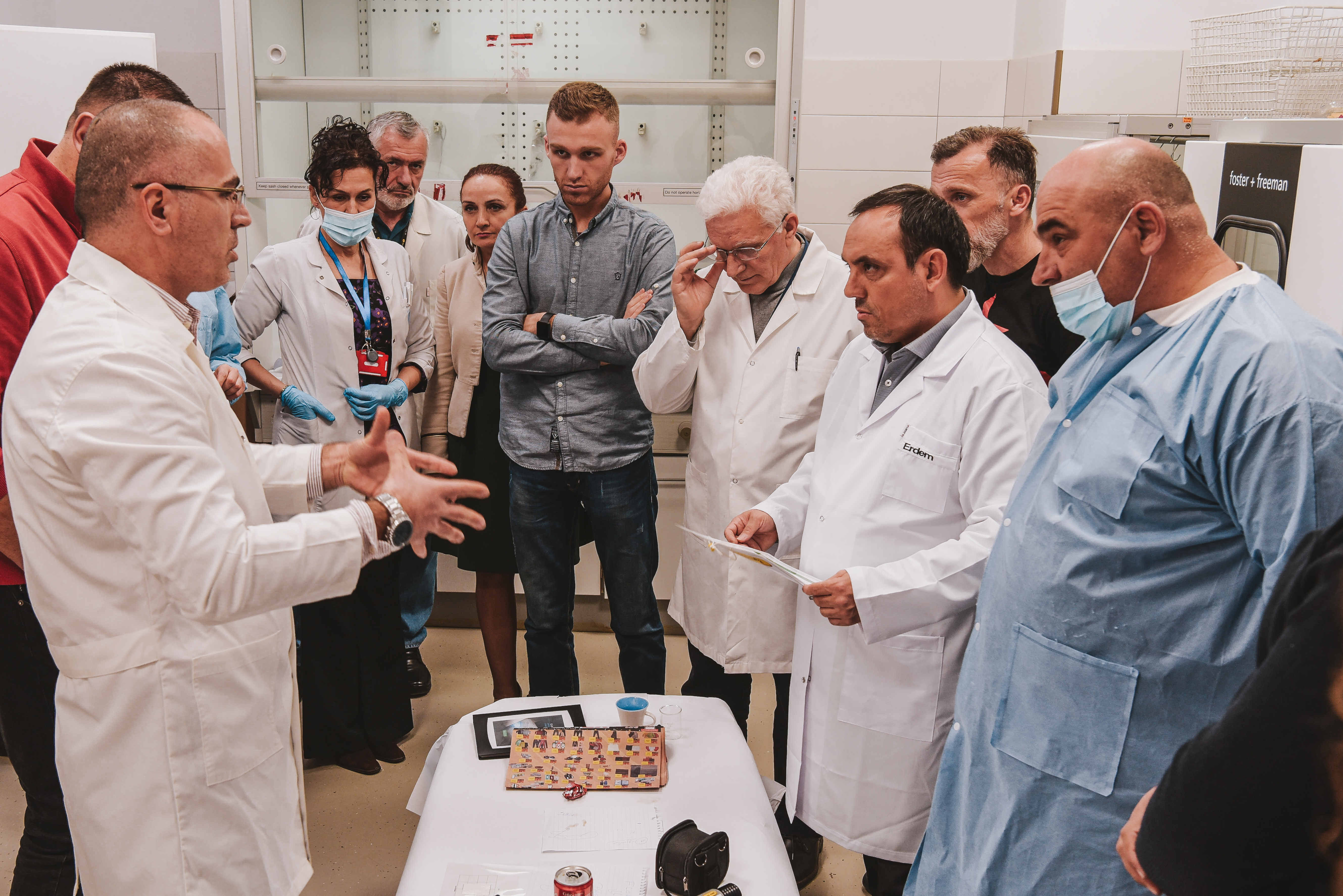 Discussing chemical and physical methods to use in developing traces of papillary lines with trainer Erdem Kara, Prishtinë/Priština, 2 March 2023.