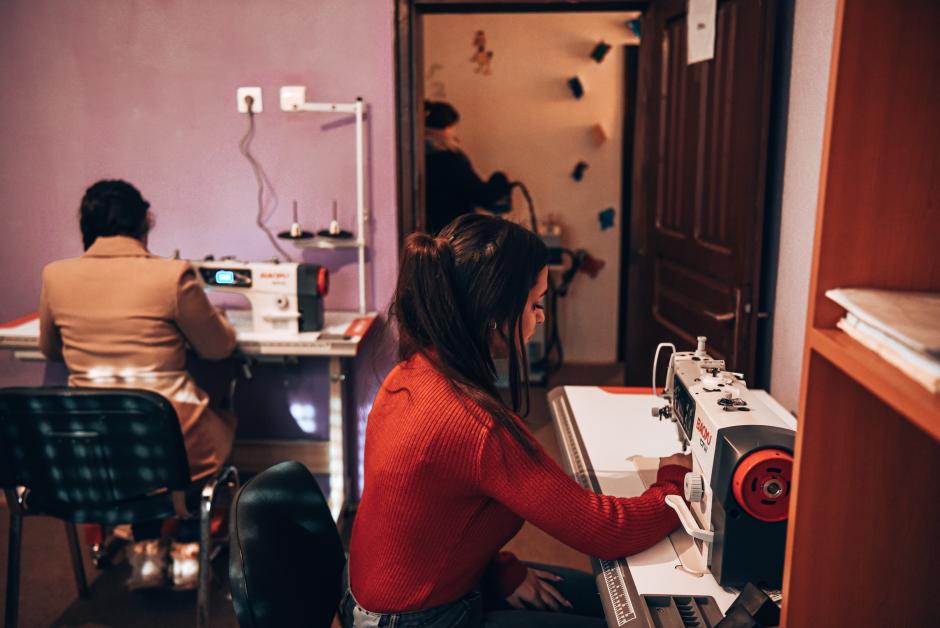 Elma Emini, Almira Emini, and Florije Burgazi with their new sewing machines and ironing equipment at the Learning Centre.