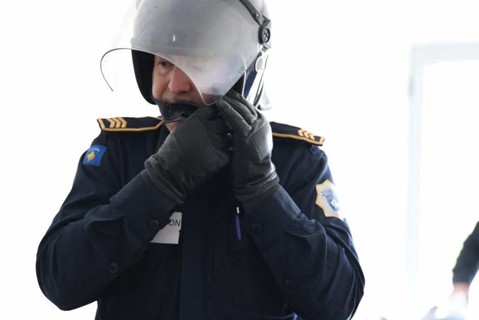 Officer prepares for a prison riot simulation in full gear. Vushtrri/Vučitrn, 27 April 2023.