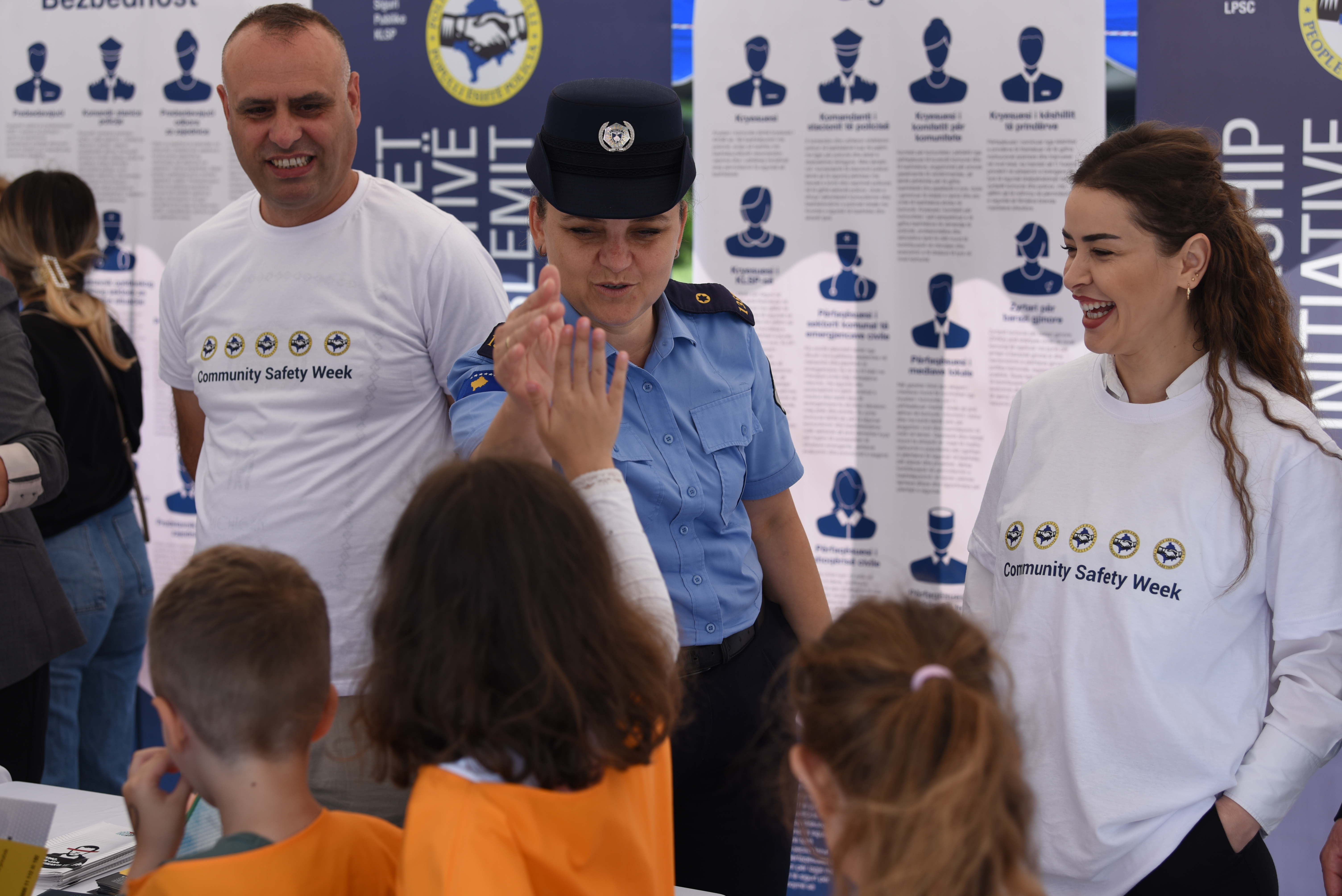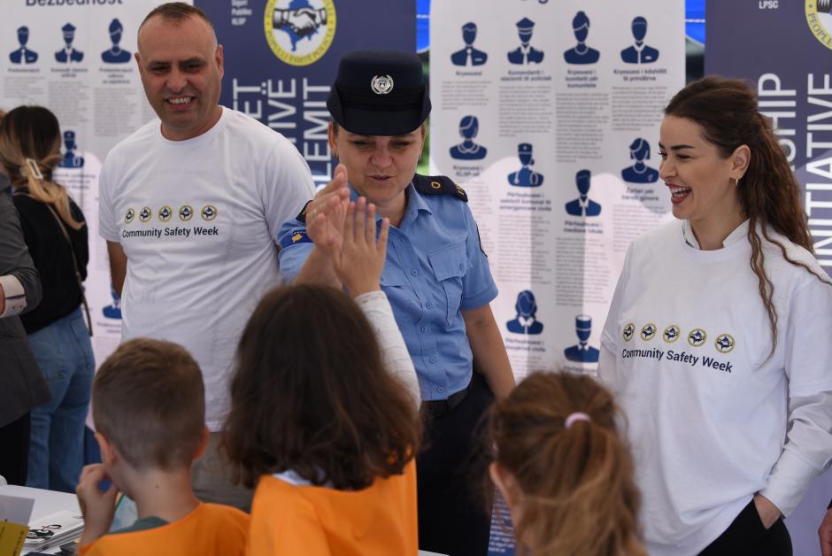 Kosovo Police officers and Local Public Safety Committees staff interacting with elementary school children during the Community Safety Week campaign, Prishtinë/Priština. 5 June 2023