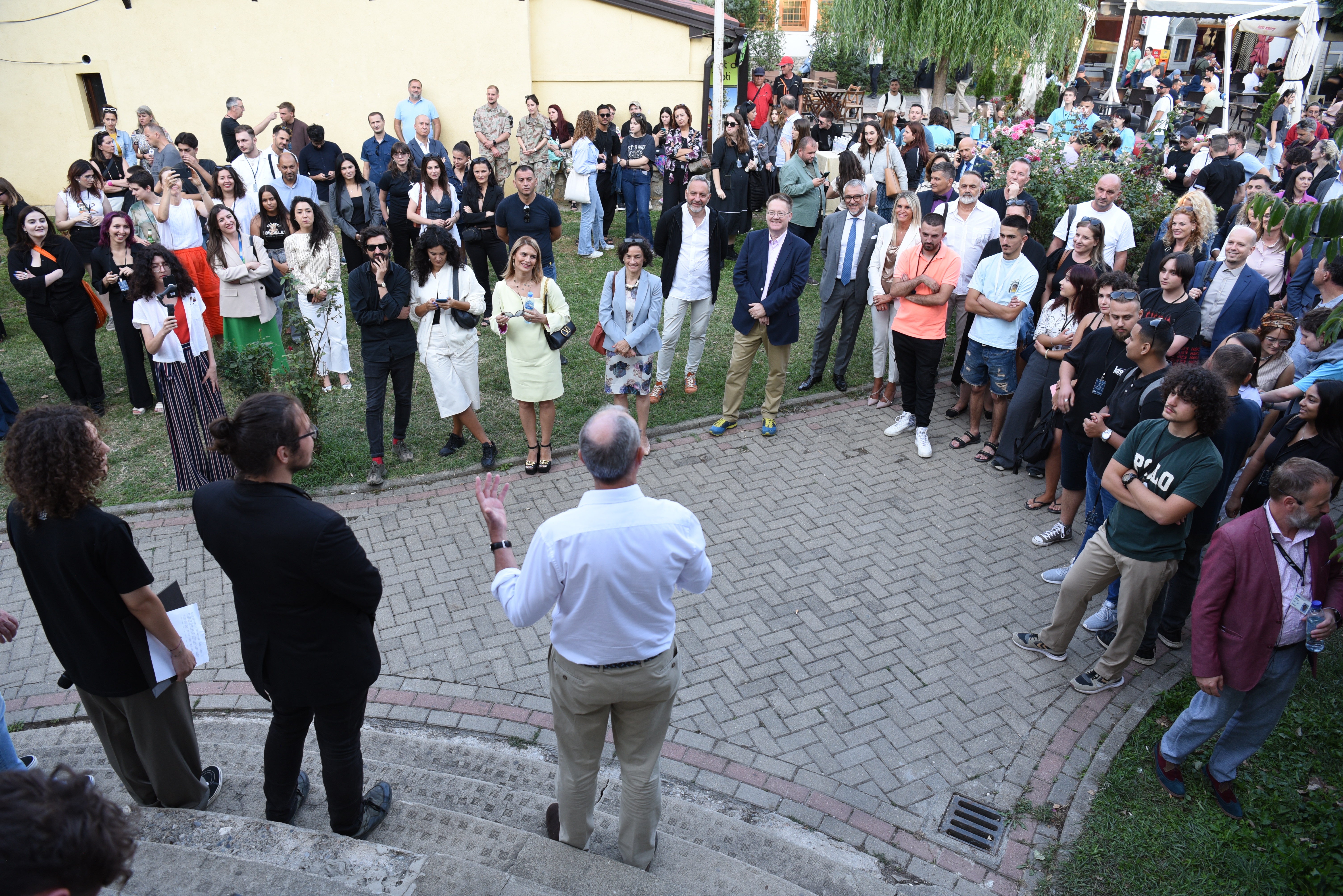 The Head of the OSCE Mission in Kosovo, Ambassador Michael Davenport, opens the “How Do I See You? – Kosovo” exhibition, alongside project participants Fisnik Eger and Era Krasniqi, Prizren, 8 August 2023
