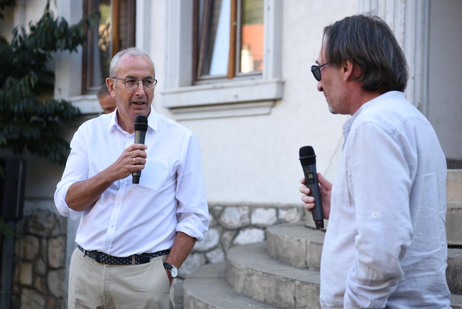 Ambassador Michael Davenport and DokuFest representative Eroll Bilibani jointly welcome the reception guests ahead of the exhibition opening, Prizren, 8 August 2023