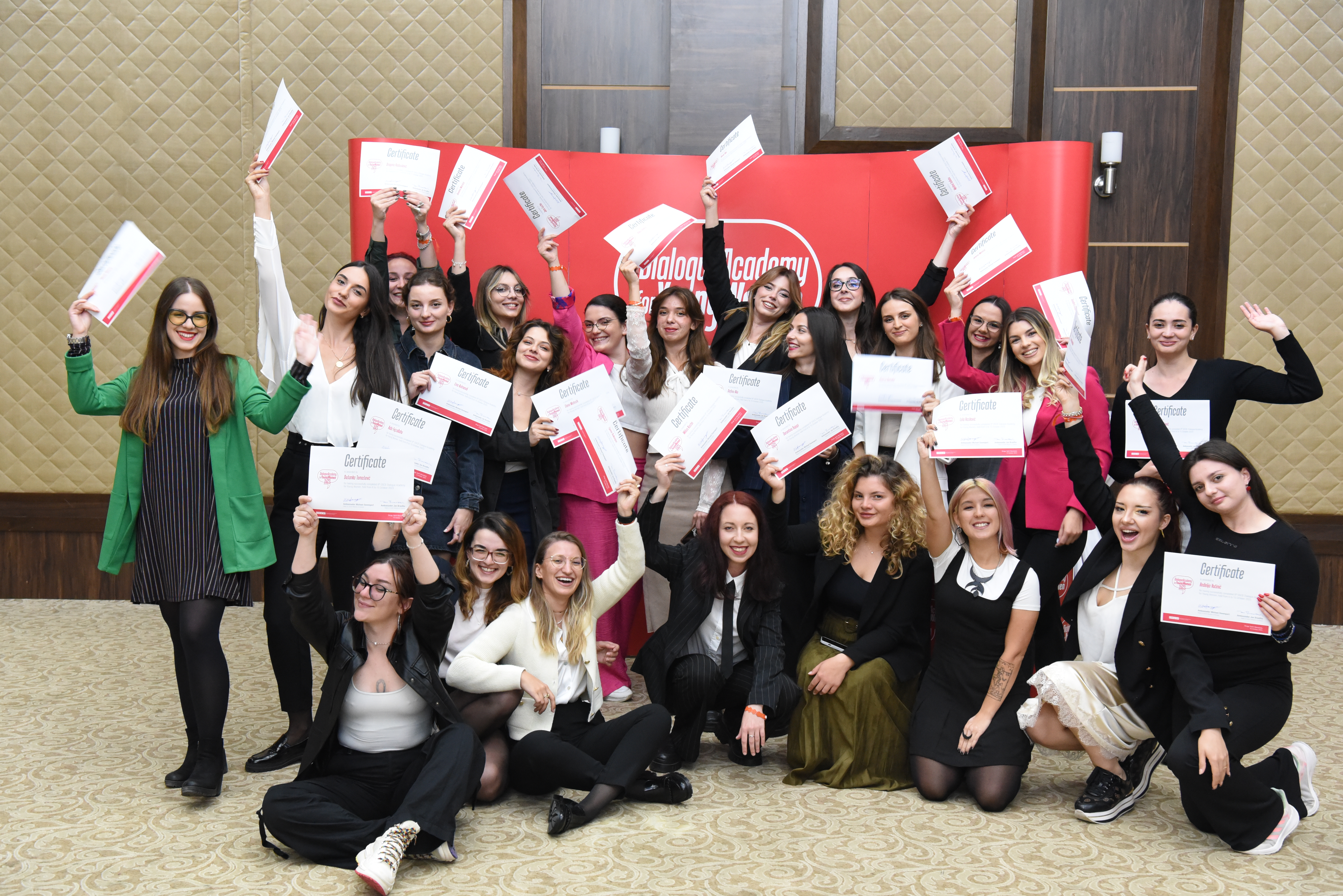Participants of the 9th edition of the OSCE Dialogue Academy for Young Women hold their certificates of completion. Struga, North Macedonia, 15 October 2023.