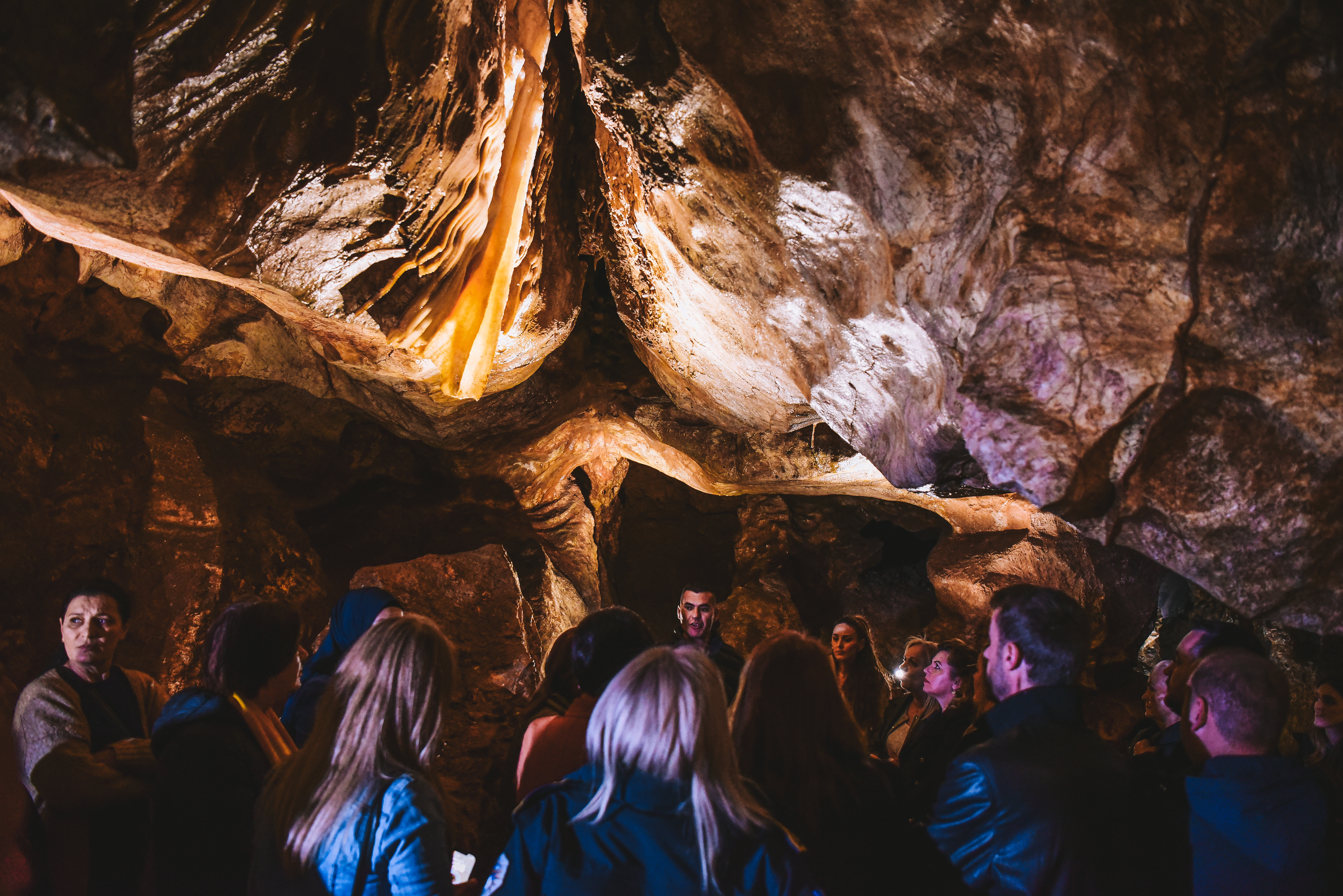 Participants and visitors of the mini-fair tour the Gadime/Gadimlje Marble Cave. The cave is one of main natural riches and touristic attractions in Kosovo.