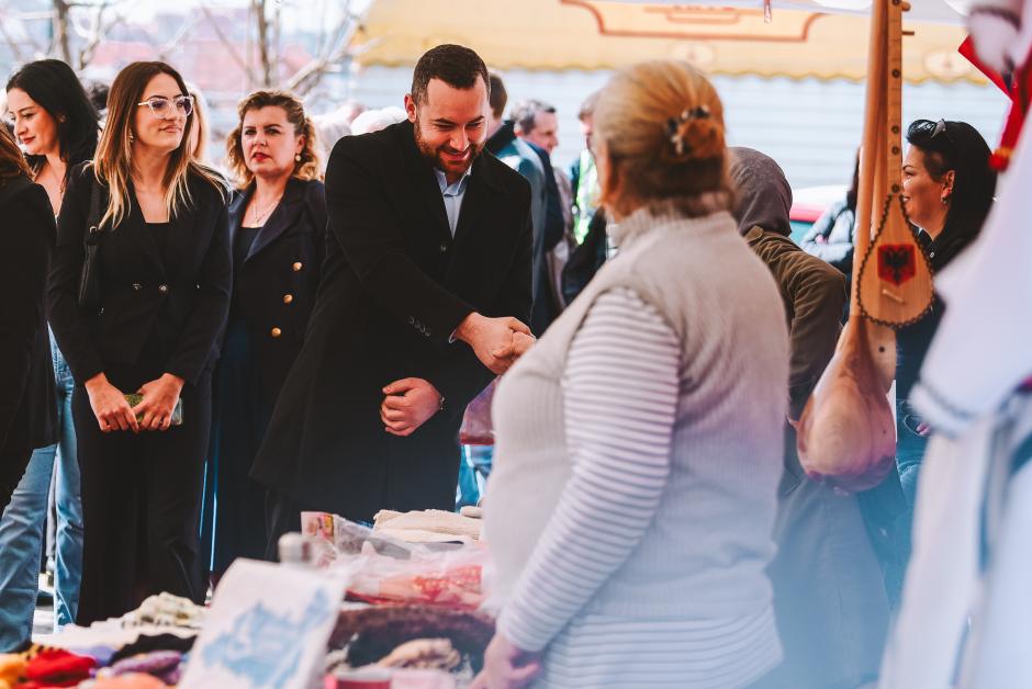 Director of Lipjan/Lipljan Department of Economy and Development Valon Pacolli greets participants of the fair in Gadime/ Gadimlje.