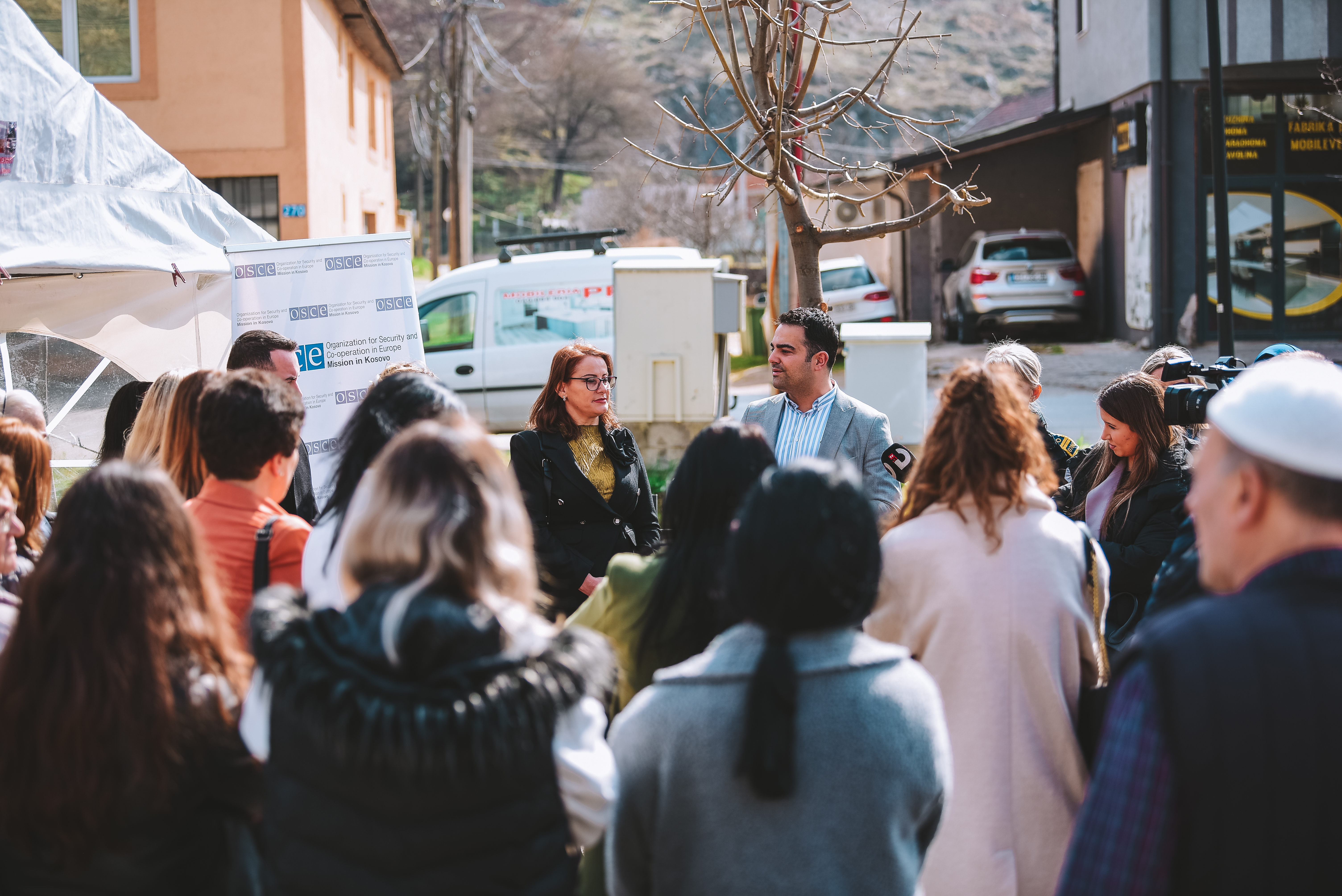 Deputy Mayor Diamant Bytyqi and Local Women Caucus Chair Hyra Bytyqi address the media at the fair.