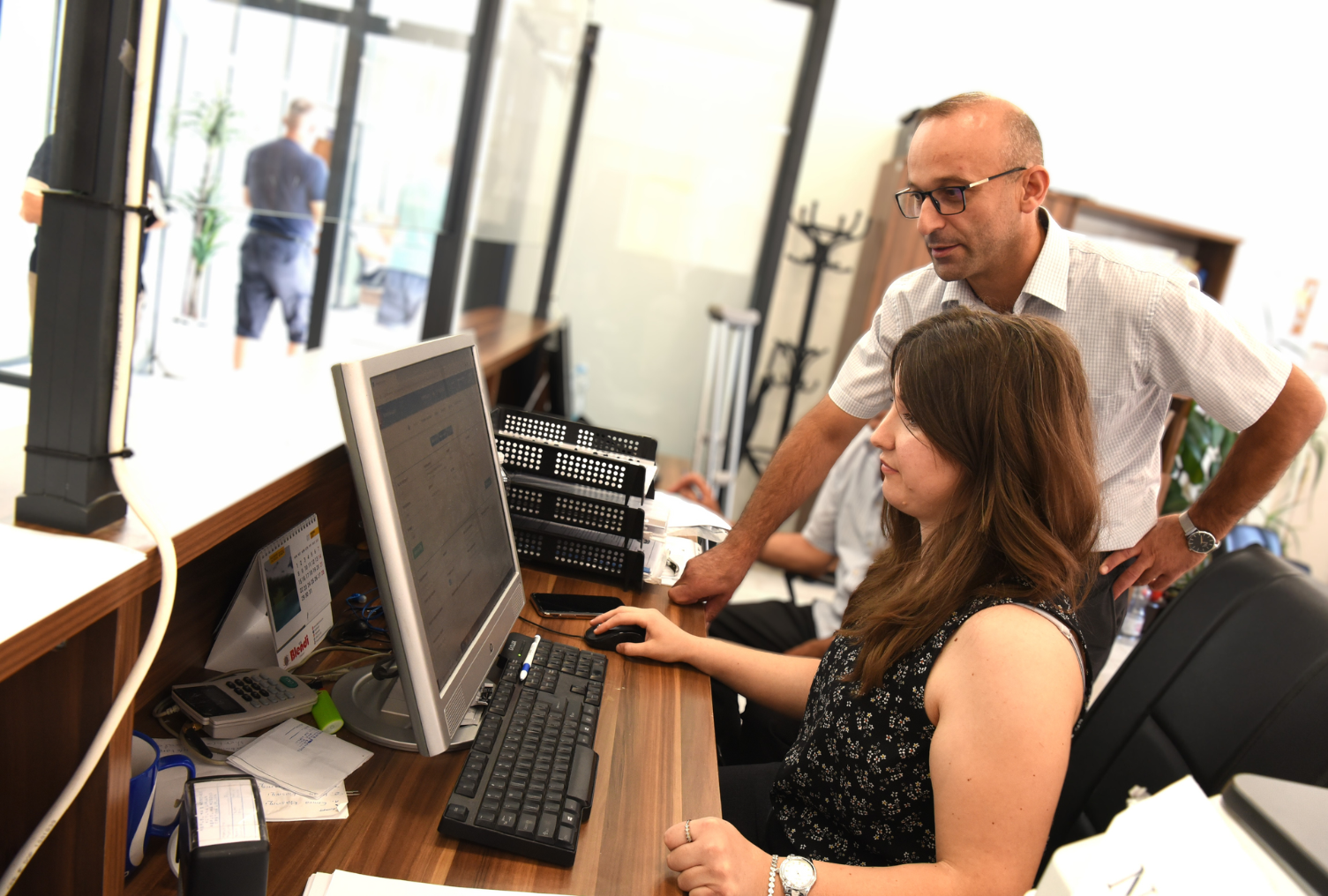 Malborë Qerimi showing a resident request to Burim Gashi, Head of the General Administration Section, during her apprenticeship with the Lipjan/Lipljan municipality, 1 August 2024.