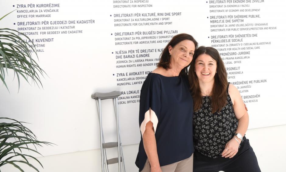 Malborë Qerimi (right) with Senior Programme Assistant in the OSCE Mission in Kosovo, Kimete Jashanica (left), outside of the entrance to the Lipjan/Lipljan municipality where Malborë is an apprentice, 1 August 2024.