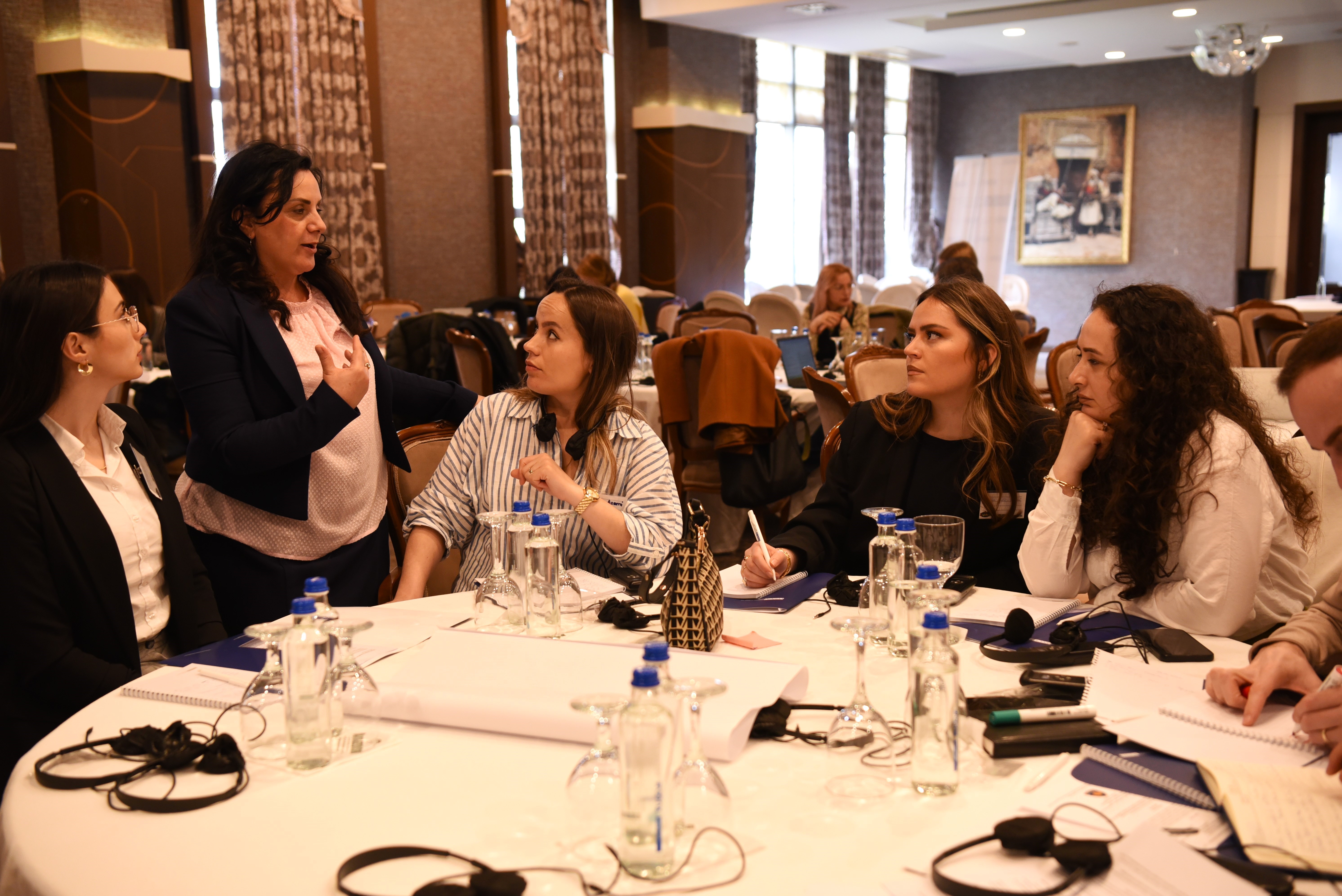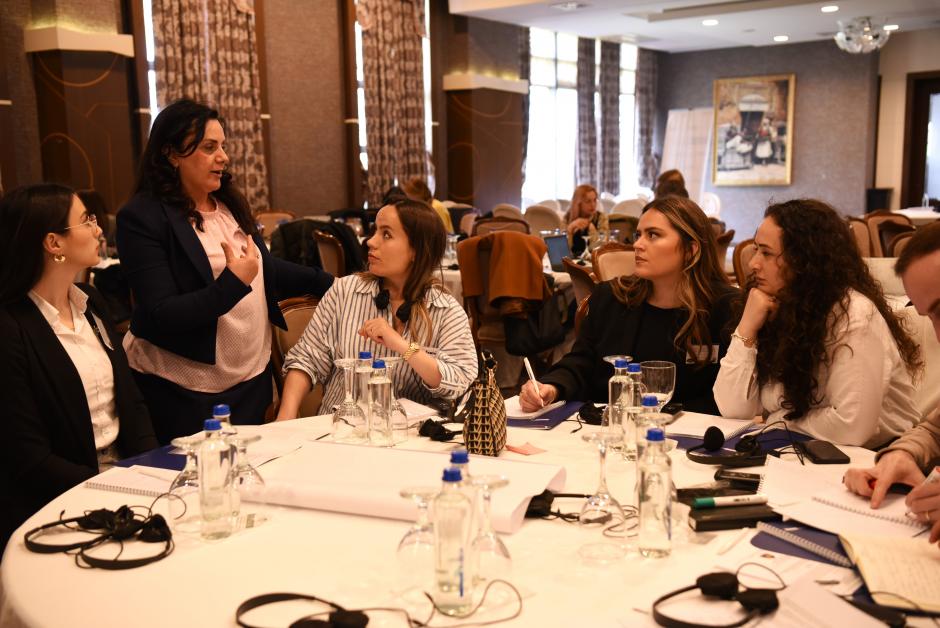 OSCE staff member Valentina Bejtullahu-Turjaka talks to workshop participants during group work, Obiliq/Obilić, 3 April 2025.