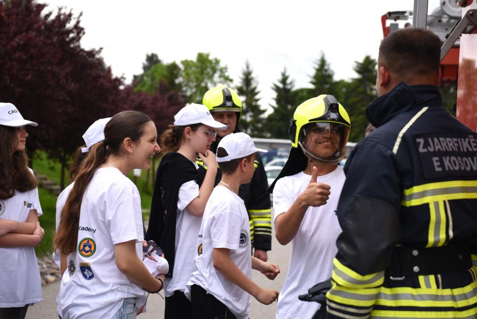 Excited pupils proudly sporting firemen’s helmet during hands-on simulation exercise, ready for action. Vushtrri/Vučitrn, 8 May 2025.(OSCE/Venla Aalto)