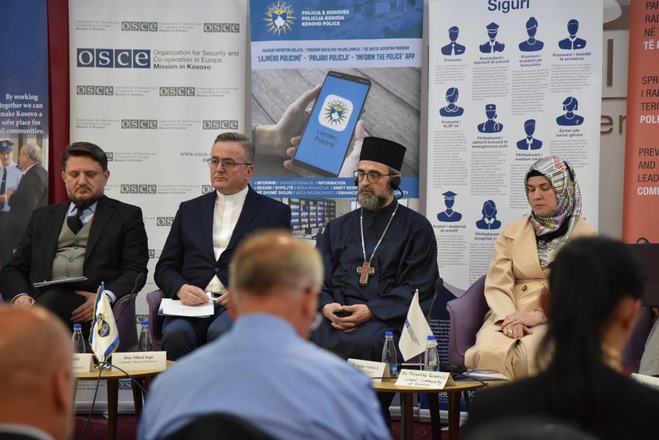Religious community representatives in Kosovo, Vedat Sahiti, Don Mikel Sopi, Srđan Stanković, and Florentina Tërmkolli engage in a panel discussion focused on raising community awareness about the dangers of violent extremism, supported by the Mission. Prishtinë/Priština, 14 May 2025.(OSCE/Migjen Abrashi)