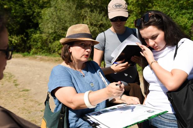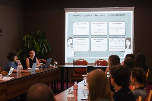 Architect Kaltrinë Ymeri from the Regional Centre for Cultural Heritage in Gjilan/Gnjilane discusses tools and techniques used in heritage documentation. 19 August 2025 (OSCE/Leurina Mehmeti).