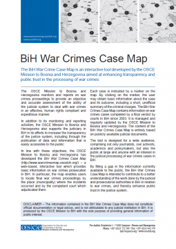 The BiH War Crime Case Map is an interactive tool developed by the OSCE Mission to Bosnia and Herzegovina aimed at enhancing transparency and public trust in the processing of war crimes. The Mission monitors and reports on war crimes proceedings to provide an objective and accurate assessment of the ability of the judicial system to deal with war crimes in an effective, human rights compliant and expeditious manner.