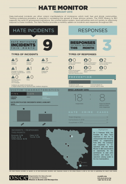 Hate Monitor is a monthly visualization of the Mission’s hate crimes monitoring data. It presents the latest data on all known bias-motivated incidents and responses to these incidents by the justice sector, local authorities, and civil society throughout Bosnia and Herzegovina.
