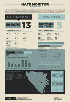 Hate Monitor is a monthly visualization of the Mission’s hate crimes monitoring data. It presents the latest data on all known bias-motivated incidents and responses to these incidents by the justice sector, local authorities, and civil society throughout Bosnia and Herzegovina.