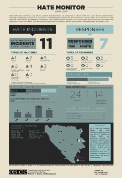 The Hate Monitor is a monthly visualization of the Mission’s hate crimes monitoring data. It presents the latest data on all known bias-motivated incidents and responses to these incidents by the justice sector, local authorities, and civil society throughout Bosnia and Herzegovina.