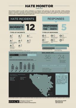 The Hate Monitor is a monthly visualization of the Mission’s hate crimes monitoring data. It presents the latest data on all known bias-motivated incidents and responses to these incidents by the justice sector, local authorities, and civil society throughout Bosnia and Herzegovina.