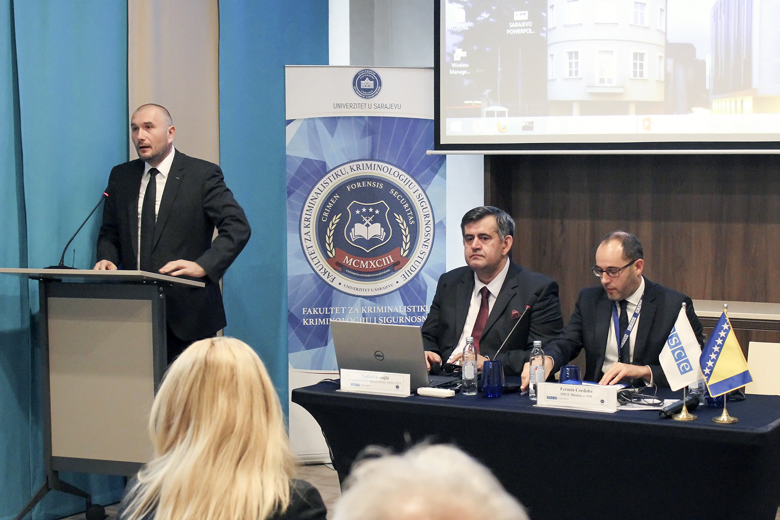 Sasa Bojanic of the OSCE Mission to BiH (l), Nedzad Korajlic, Dean of the University of Sarajevo Faculty for Criminal Justice, Criminology and Security Studies (c) and Fermin Cordoba, Head of Human Dimension Department at the OSCE Mission to BiH (r) at an expert conference on hate crimes in South-East Europe, Sarajevo, 8 November 2016