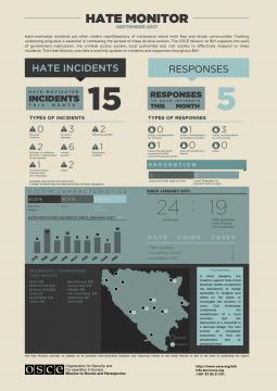 Hate-motivated incidents are often violent manifestations of intolerance which instil fear and divide communities. Tackling underlying prejudice is essential in combating the spread of these divisive actions. The OSCE Mission to Bosnia and Herzegovina supports the work of government institutions, the criminal justice system, local authorities and civil society to effectively respond to these incidents. The Hate Monitor provides a monthly update on incidents and responses throughout Bosnia and Herzegovina.