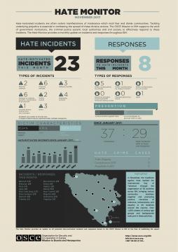 Hate-motivated incidents are often violent manifestations of intolerance which instil fear and divide communities. Tackling underlying prejudice is essential in combating the spread of these divisive actions. The OSCE Mission to Bosnia and Herzegovina supports the work of government institutions, the criminal justice system, local authorities and civil society to effectively respond to these incidents. The Hate Monitor provides a monthly update on incidents and responses throughout Bosnia and Herzegovina.