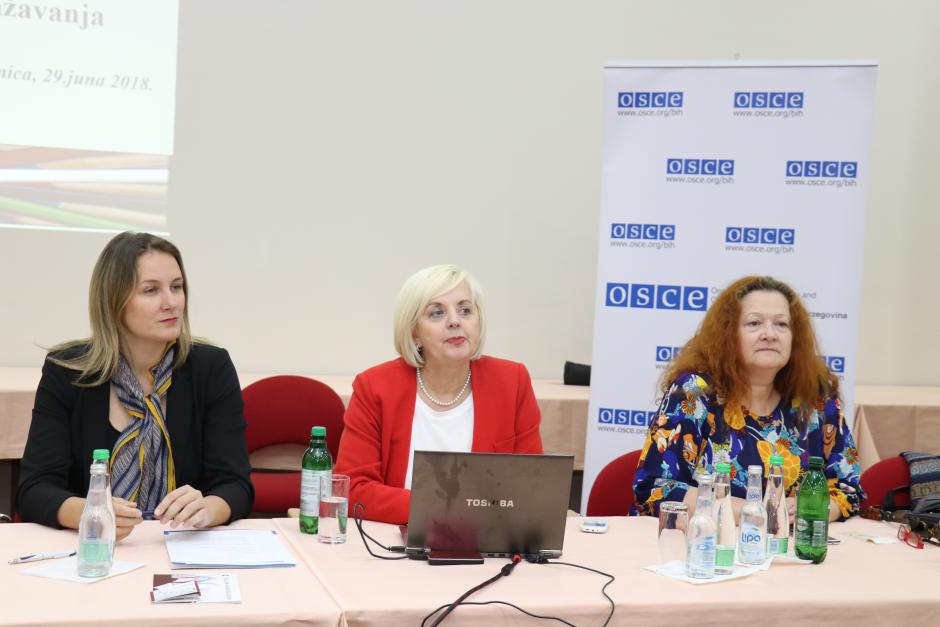 (l-r) Zeljka Sulc, Spokesperson for the OSCE Mission to Bosnia and Herzegovina, Borka Rudic, Secretary General of the Association "BH Journalists" and Ljiljana Zurovac, Program Director of the Bosnia and Herzegovina Press Council at an OSCE-organized workshop on protection mechanisms for journalists and media professionals; Zenica, 29 June 2018.