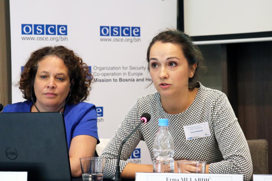 Serani Siegel, Gender Section, OSCE Secretariat and Erma Mulabdic, UN Women at a regional meeting, co-organised by the OSCE Mission to Bosnia and Herzegovina and European Institute for Gender Equality, on collection of data on gender-based violence in Bosnia and Herzegovina; Sarajevo, 6 September 2018.