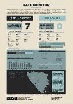 Hate-motivated incidents are often violent manifestations of intolerance which instil fear and divide communities. Tackling underlying prejudice is essential in combating the spread of these divisive actions. The OSCE Mission to Bosnia and Herzegovina supports the work of government institutions, the criminal justice system, local authorities and civil society to effectively respond to these incidents. The Hate Monitor provides a monthly update on hate-motivated incidents and responses to the incidents recorded throughout the Bosnia and Herzegovina.