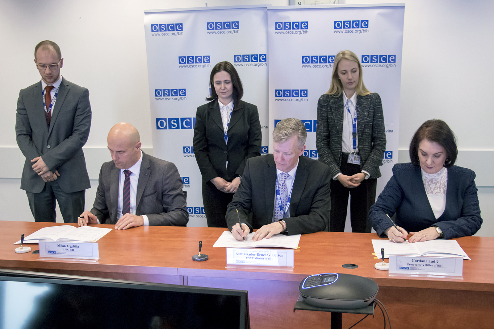 (L-R) President of the High Judicial and Prosecutorial Council of Bosnia and Herzegovina Milan Tegeltija, Head of the OSCE Mission to Bosnia and Herzegovina (BiH) Ambassador Bruce G. Berton and Chief Prosecutor of the Prosecutor’s Office of Bosnia and Hercegovina, Gordana Tadic at the ceremony of signing a Memorandum of Understanding on the development of a digital archive of all evidence pertaining to war crimes cases in the possession of the BiH Prosecutor’s Office