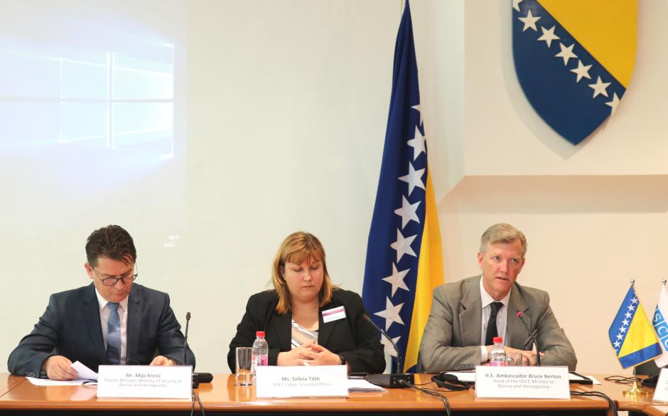 (l-r) Mijo Krešić, Deputy Minister of Security of Bosnia and Herzegovina, Szilvia Toth, OSCE Cyber Security Officer and Bruce G. Berton, Head of OSCE Mission to Bosnia and Herzegovina addressing participants at a sub-regional training course on the role of information and communication technologies in international security, Sarajevo, 23 May 2019